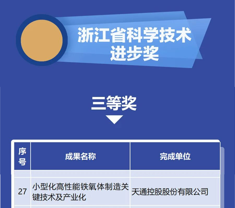 在7月11日下午召開的全省科技創(chuàng)新大會上,2021年度“浙江省科學(xué)技術(shù)進步獎”等一系列獎項揭曉,天通控股股份有限公司“小型化高性能鐵氧體制造關(guān)鍵技術(shù)及產(chǎn)業(yè)化”項目榮獲浙江省科學(xué)技術(shù)進步獎三等獎。這是天通公司磁性材料第八次獲得浙江省科學(xué)技術(shù)進步獎。